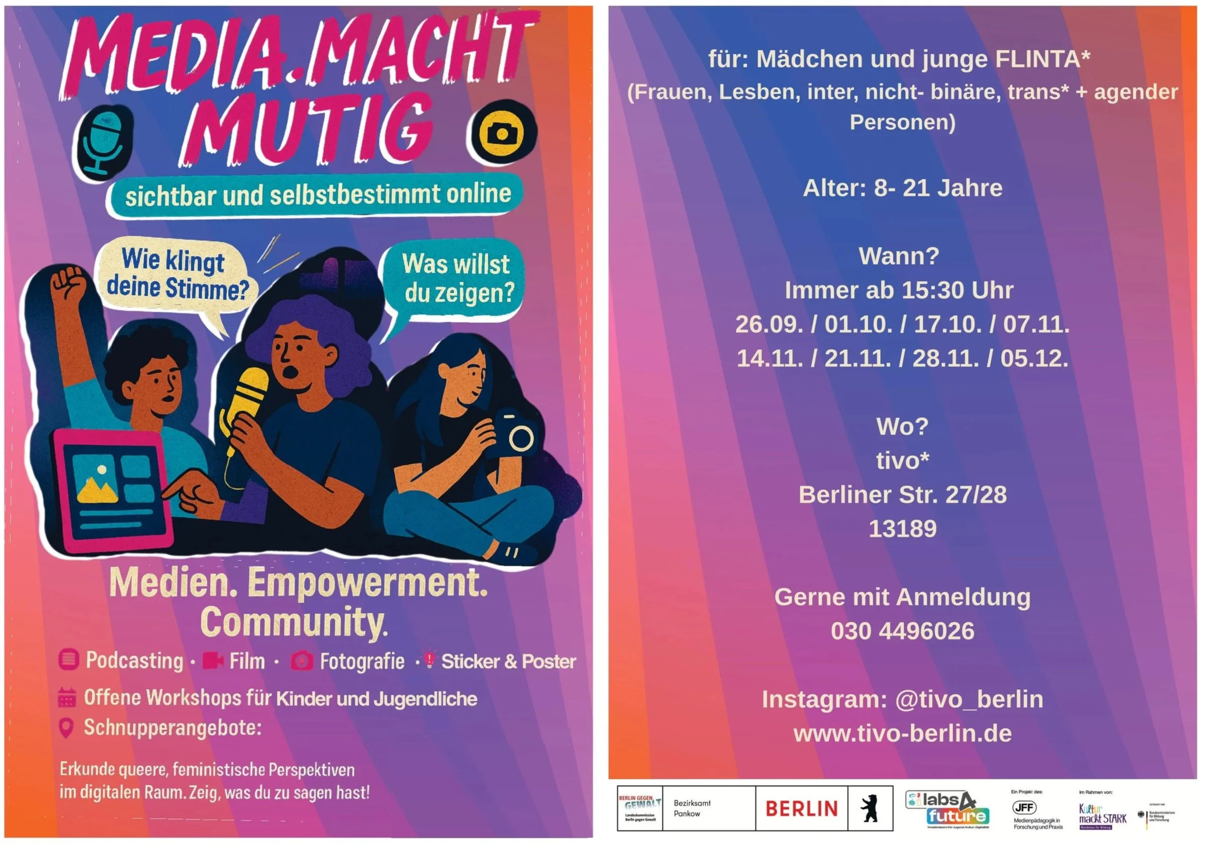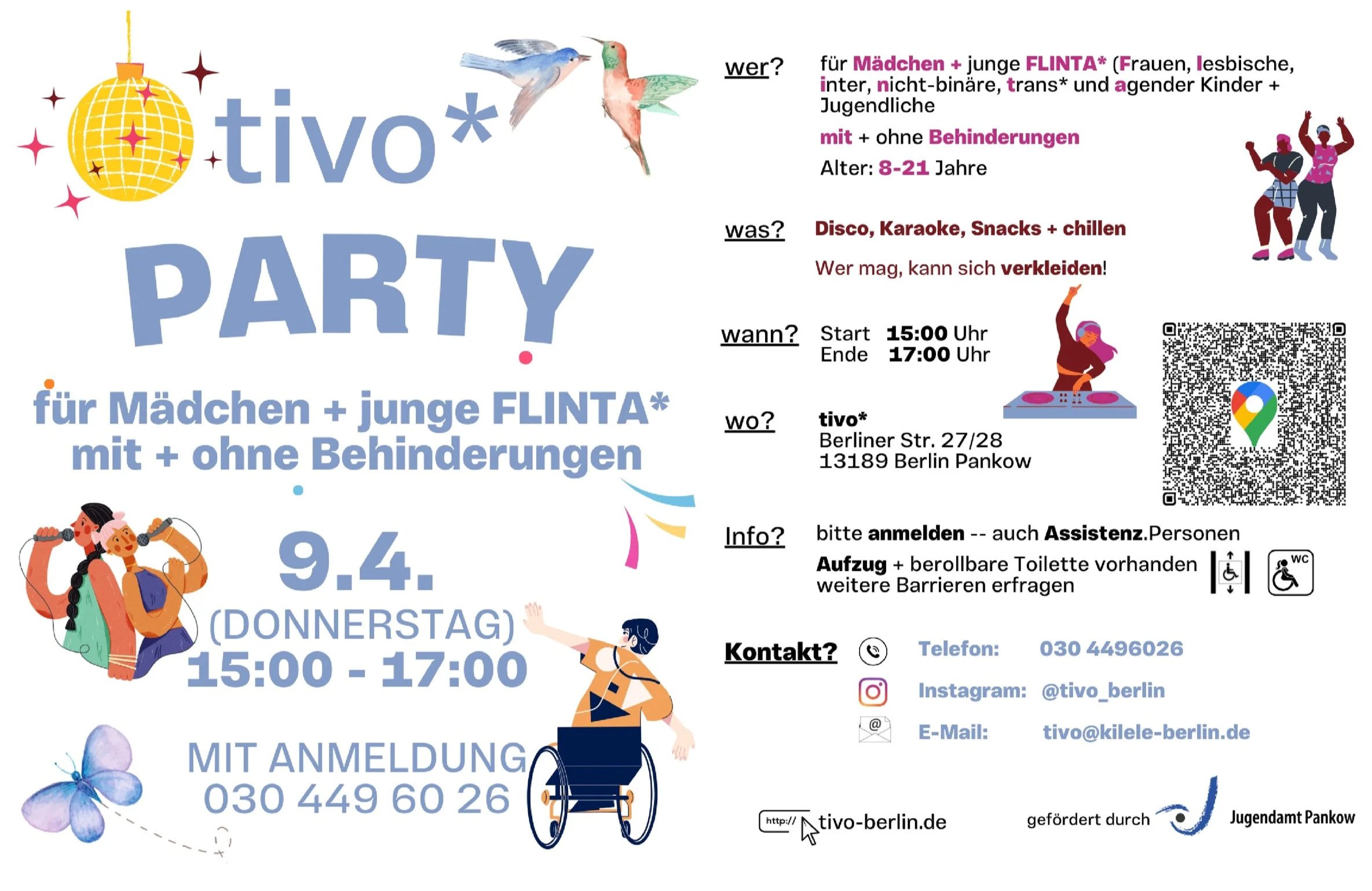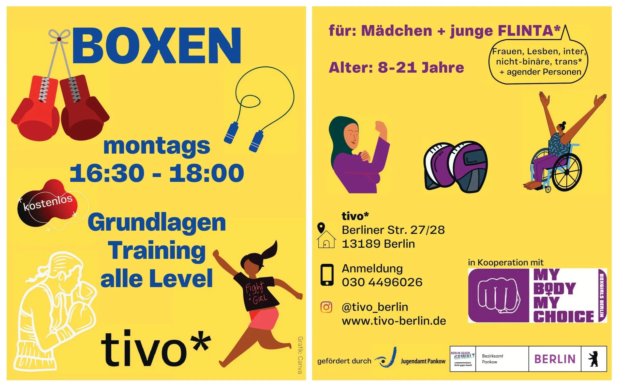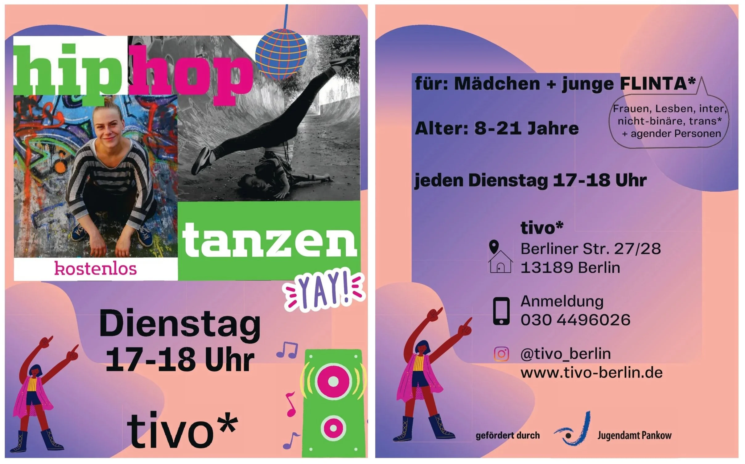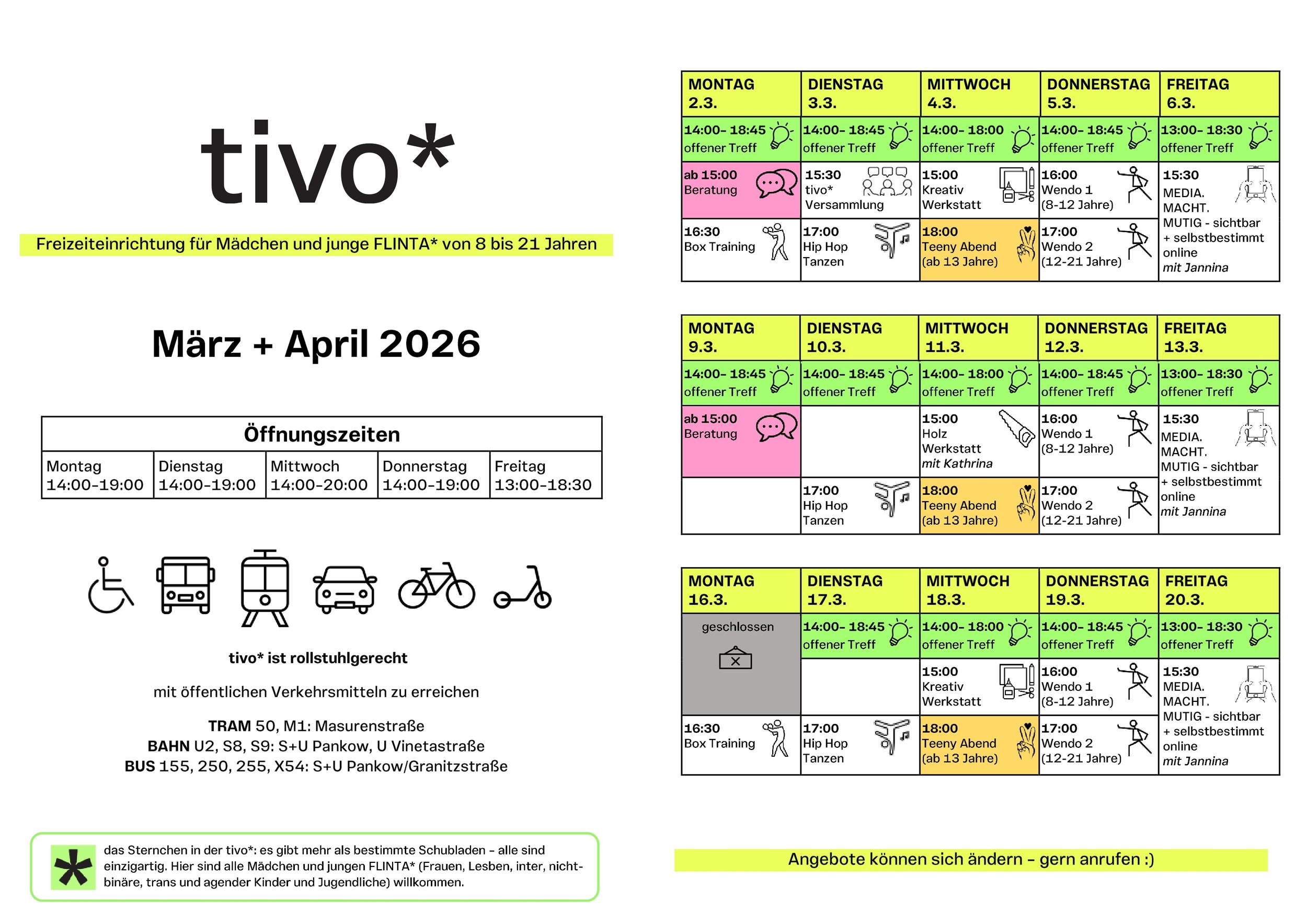 Jede Woche mittwochs ist die gesamte tivo* ab 18 Uhr nur für Teenies (ab 13 Jahren) geöffnet. Es gibt Programm oder einfach Offenen Treff für Ältere. Vor allem bestimmte Themen, Spiele oder Filme, die erst ab einem bestimmten Alter interessant sind, haben hier Platz - und Ruhe. Aber die tivo* kann auch zum Party- oder Trainings-Raum genutzt werden oder es werden neue feministische Projekte ausgeheckt… Ihr bestimmt wofür ihr den Abend nutzen möchtet!