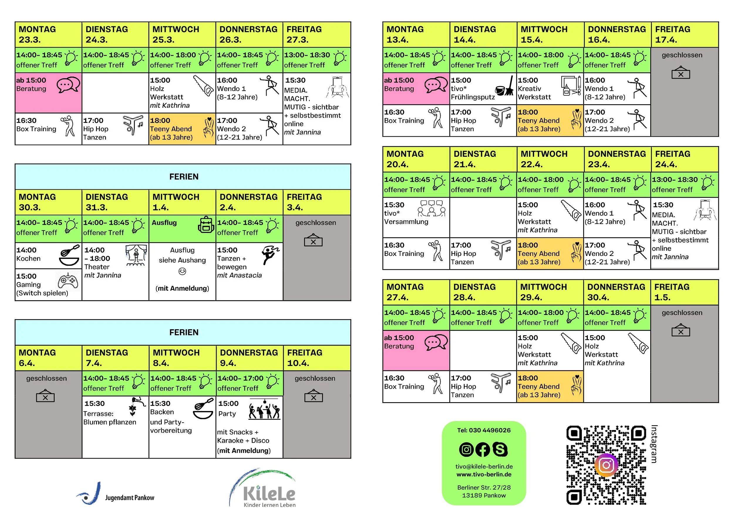 Anmeldungen fürs Ferienprogramm gibt's in der tivo // März + April // Kurse und einzelne Angebote // ruft an bei Fragen //