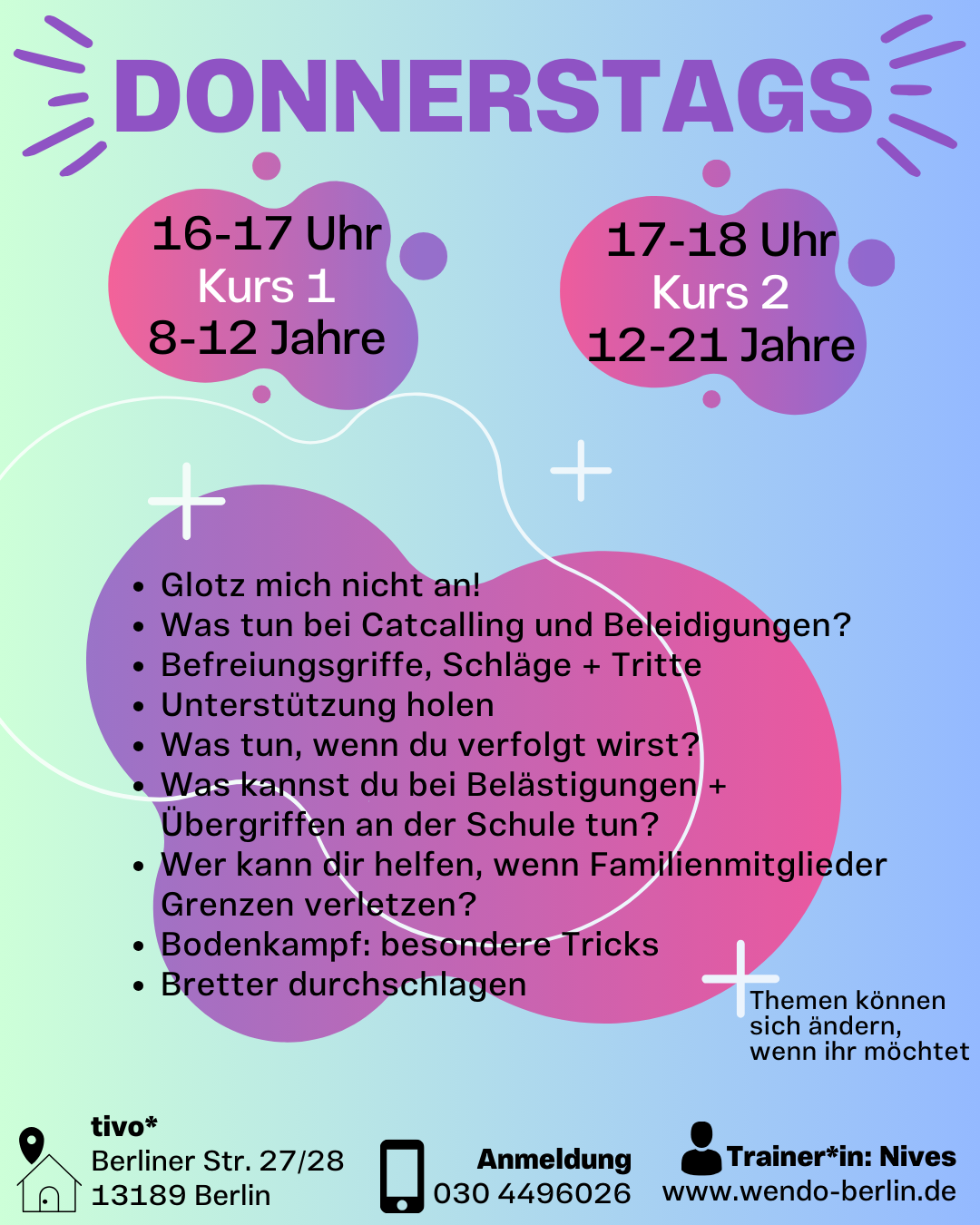 In den Berliner Schulferien findet der Kurs nicht statt.